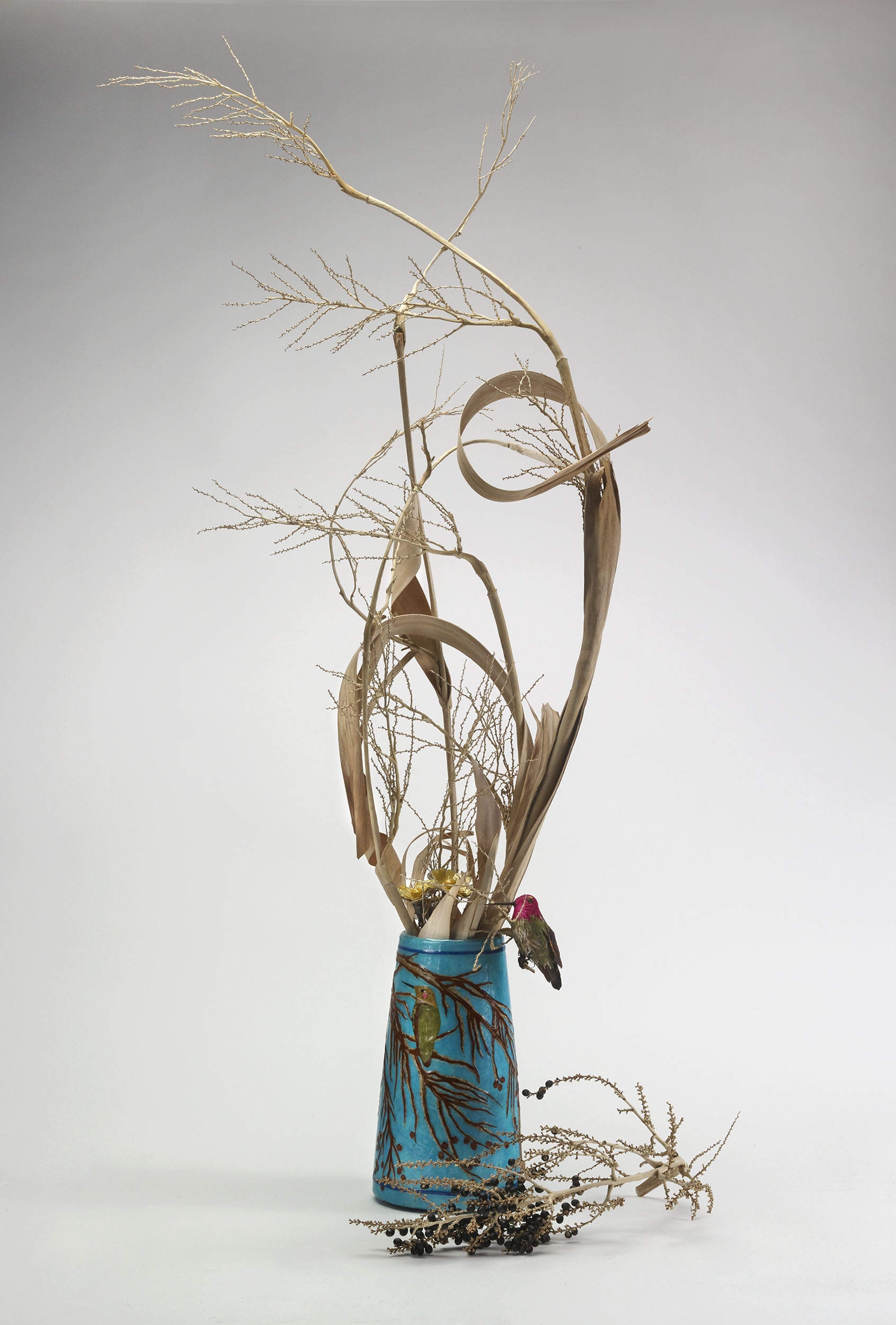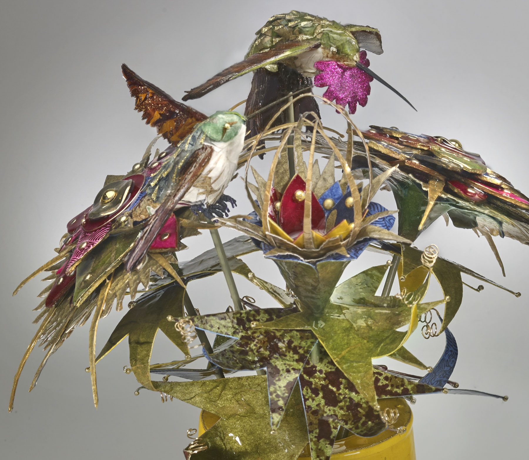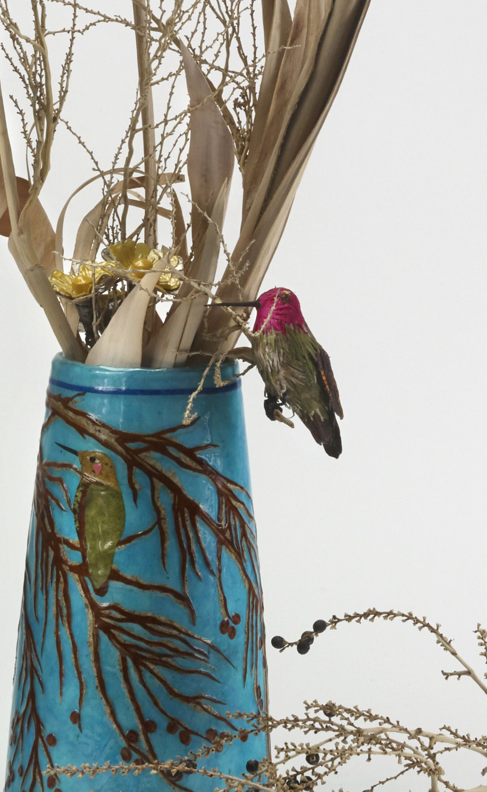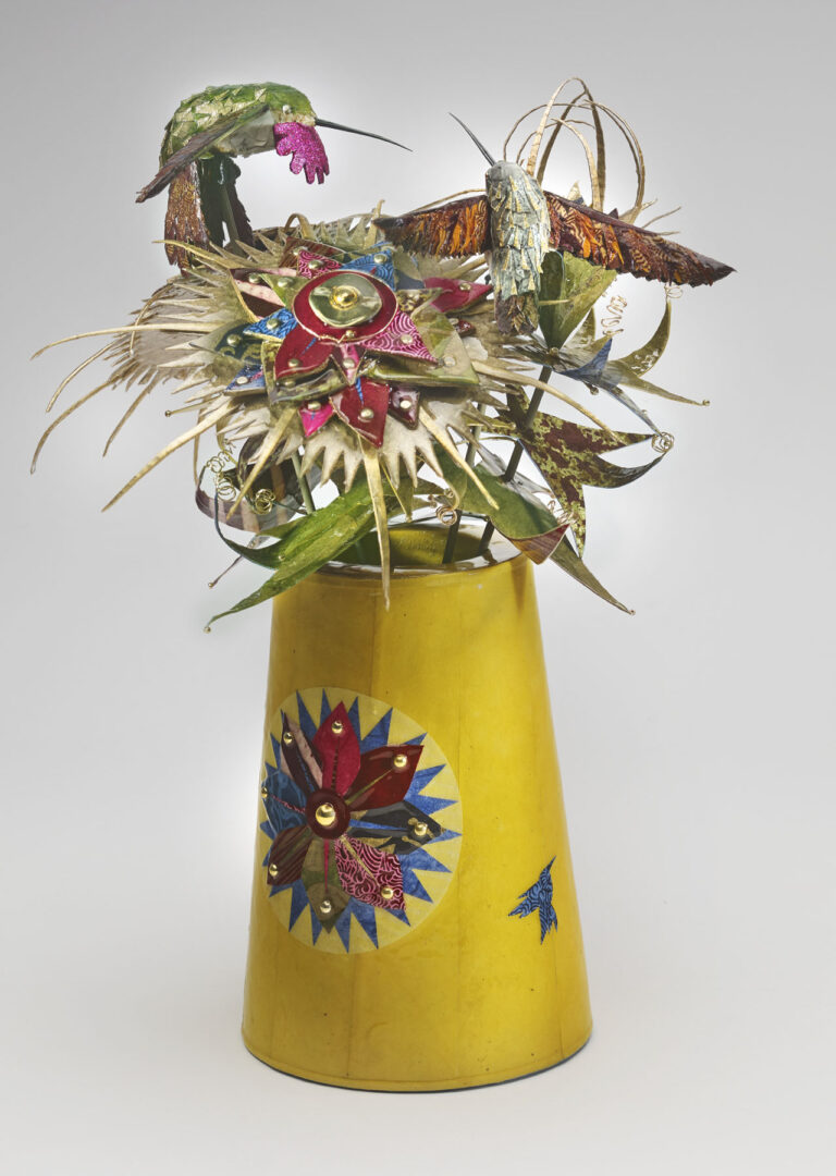 Pinewood vases, paper mache, artist papers, acrylic paints, acrylic spray paints, wire, seeds, native gourds, gold thread, gold metal tassels, quills, PVA, UV-resistant spray resin.